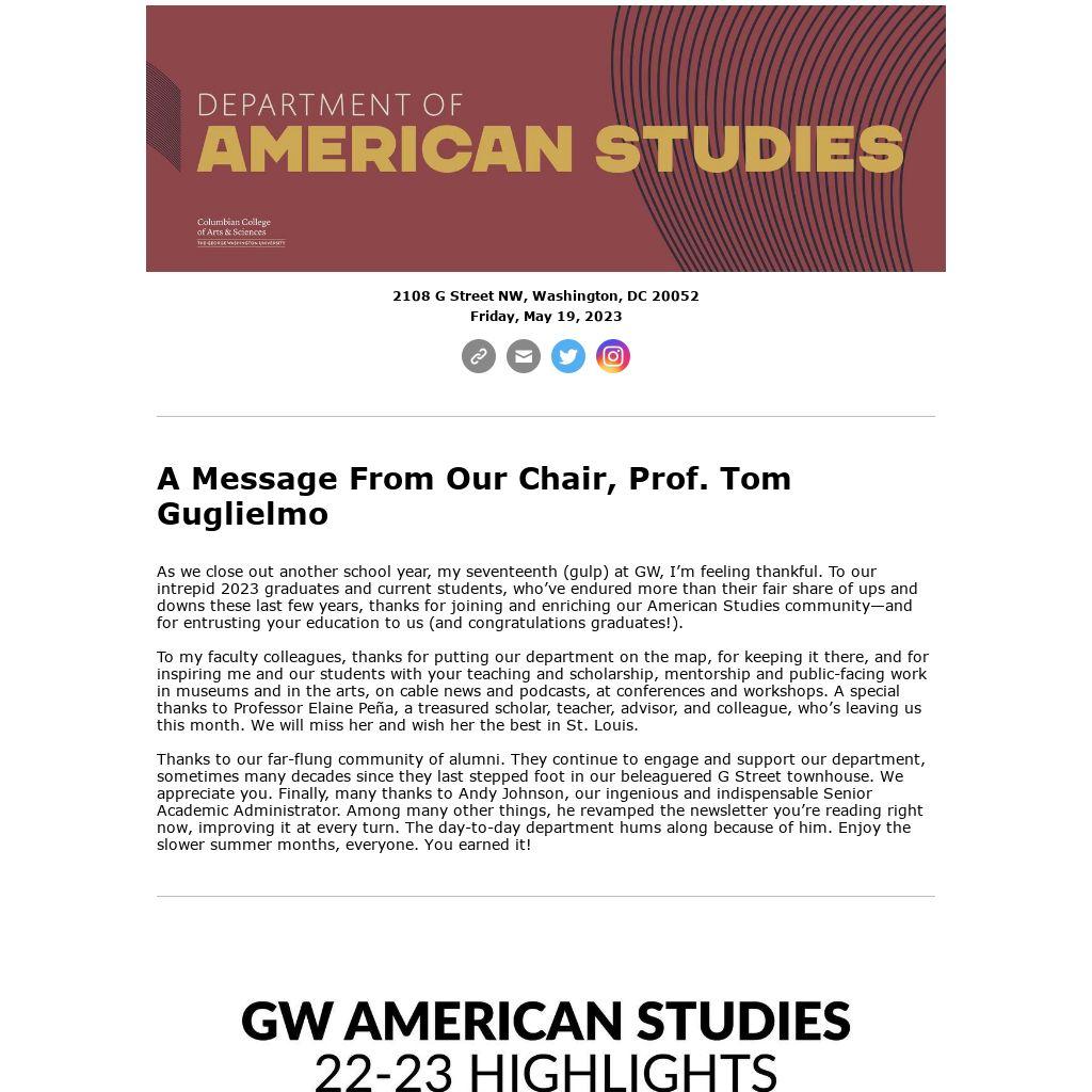 As we close out another school year, my seventeenth (gulp) at GW, I’m feeling thankful. To our intrepid 2023 graduates and current students, who’ve endured more than their fair share of ups and downs these last few years, thanks for joining and enriching our American Studies community—and for entrusting your education to us (and congratulations graduates!).
