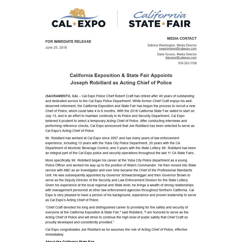 Cal Expo congratulates Joe Robillard as he assumes the role of Acting Chief of Police, effective immediately.