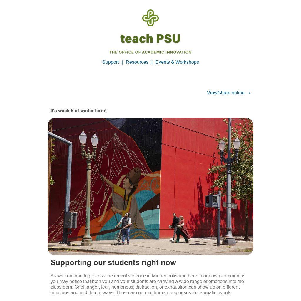 Please know that you are part of a larger PSU community. Our resource below includes strategies for your classroom and campus resources that you can share with your students during this time. If you’d like to talk through classroom dynamics, get support navigating a difficult moment, or think together about what might help your students—or yourself—reach out to us.