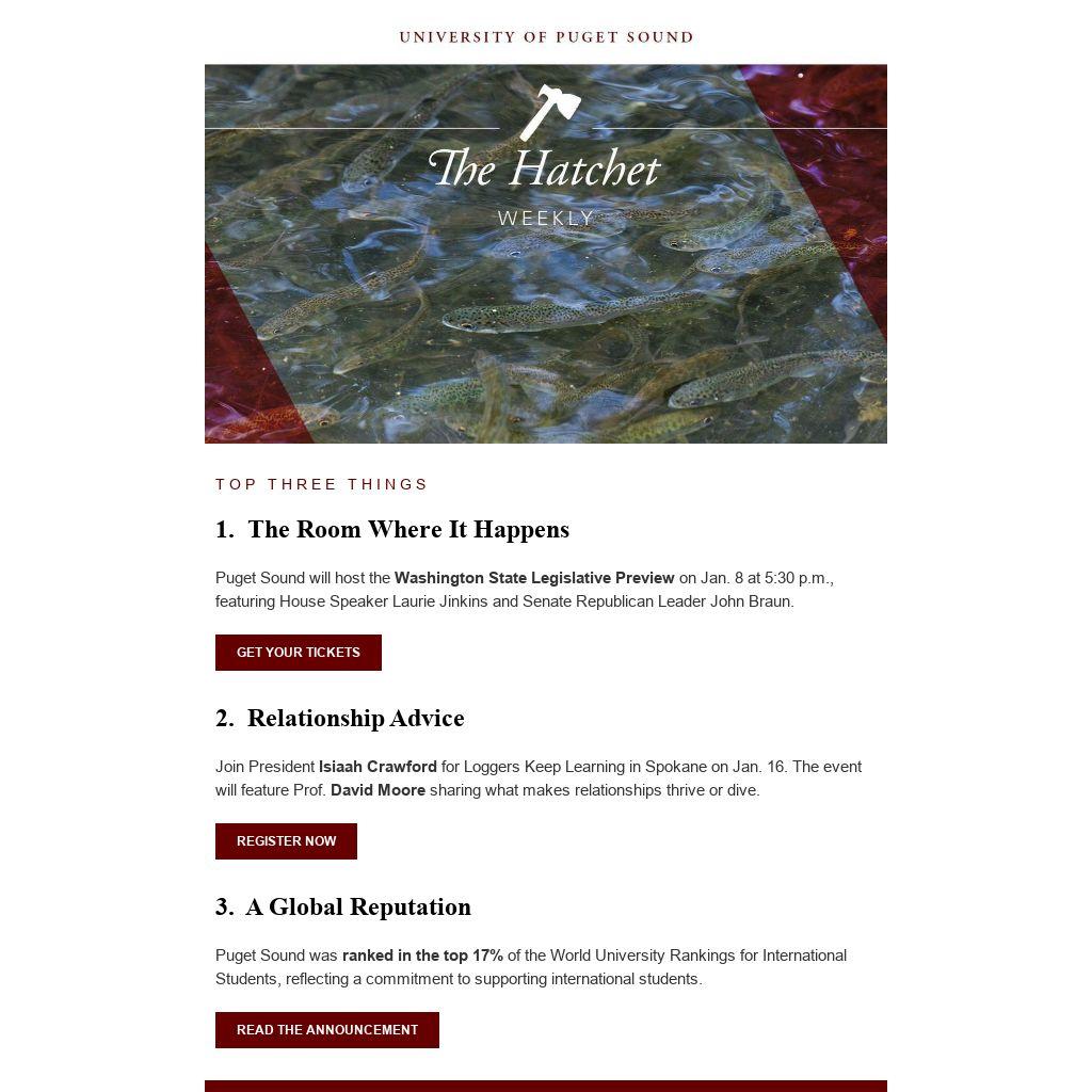 Puget Sound will host the Washington State Legislative Preview on Jan. 8 at 5:30 p.m., featuring House Speaker Laurie Jinkins and Senate Republican Leader John Braun.
