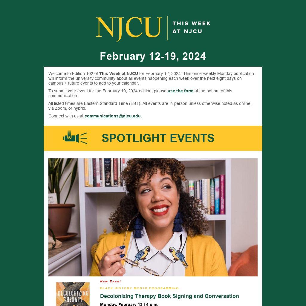 Welcome to Edition 102 of This Week at NJCU for February 12, 2024. This once-weekly Monday publication will inform the university community about all events happening each week over the next eight days on campus + future events to add to your calendar.