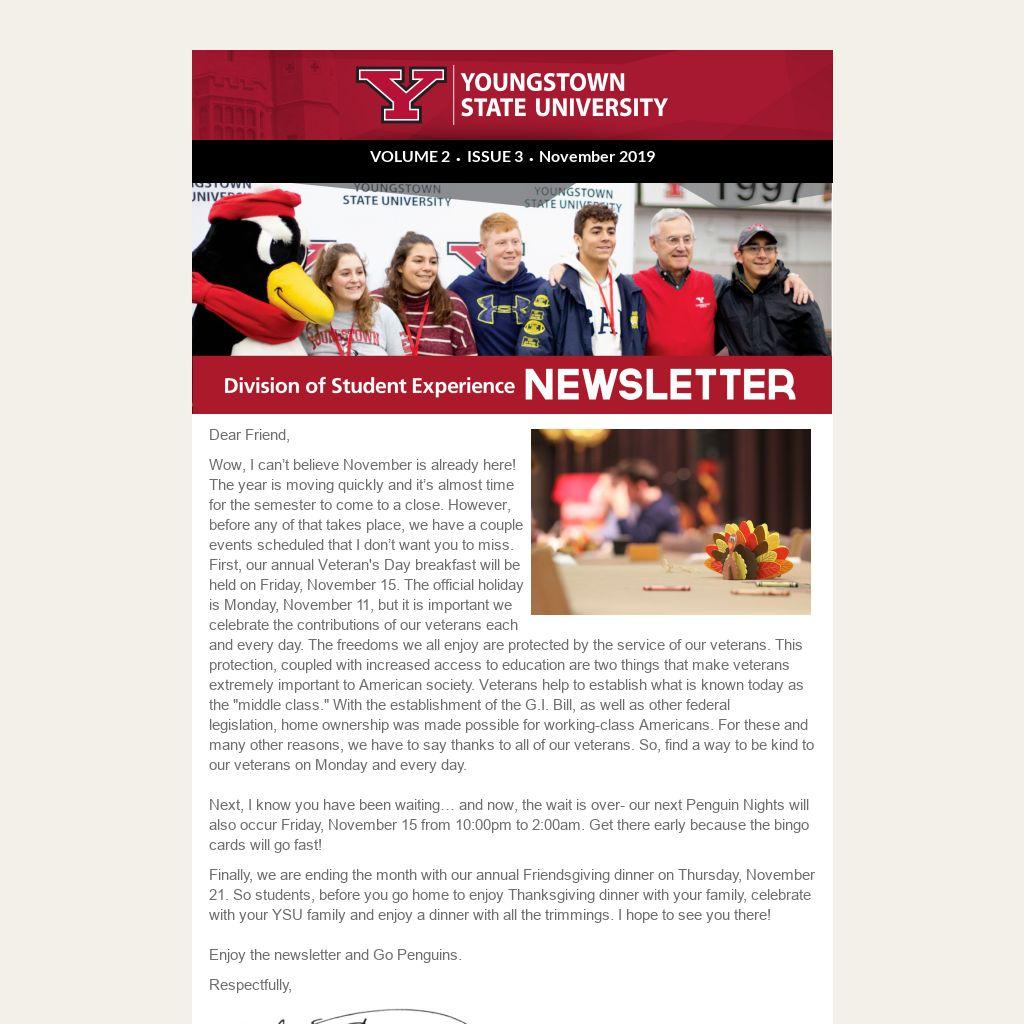 Finally, we are ending the month with our annual Friendsgiving dinner on Thursday, November 21. So students, before you go home to enjoy Thanksgiving dinner with your family, celebrate with your YSU family and enjoy a dinner with all the trimmings. I hope to see you there!