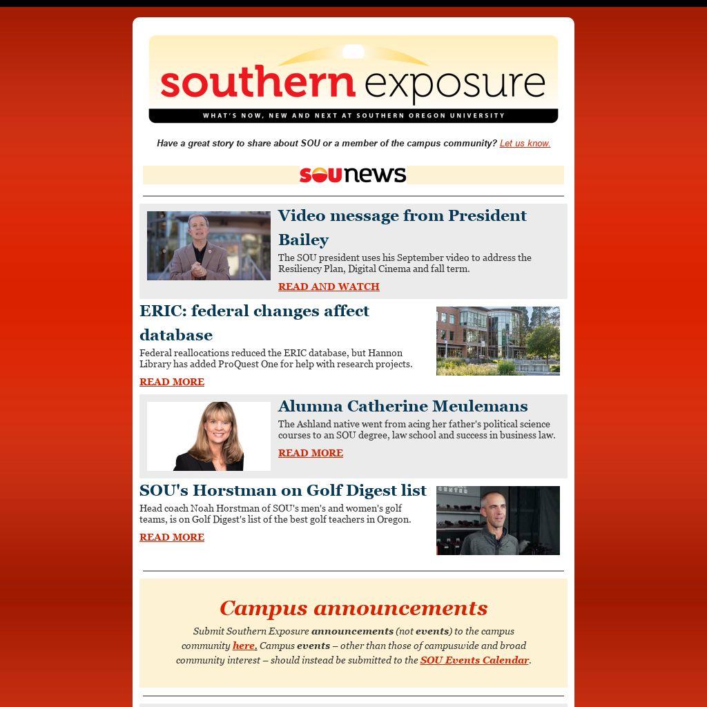 Submit Southern Exposure announcements (not events) to the campus community here. Campus events – other than those of campuswide and broad community interest – should instead be submitted to the SOU Events Calendar.