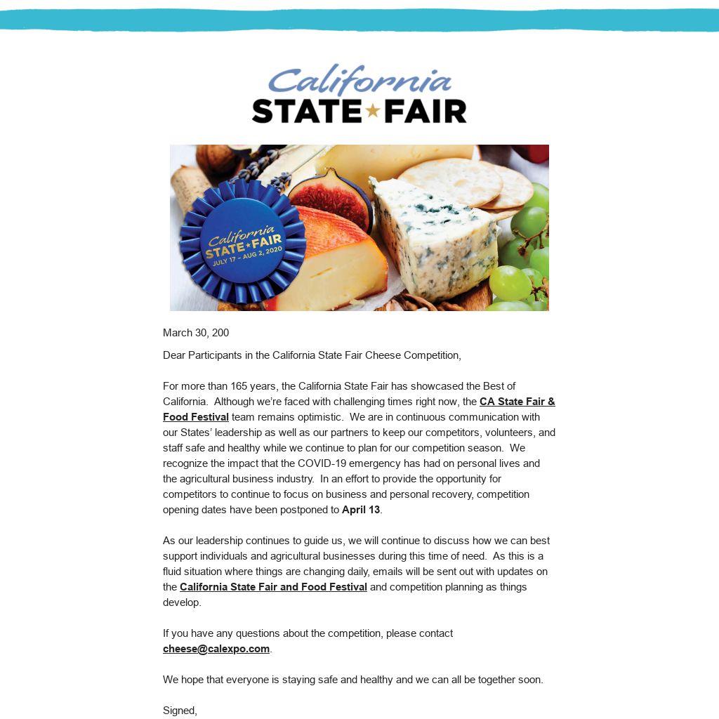 Dear Participants in the California State Fair Cheese Competition, For more than 165 years, the California State Fair has showcased the Best of California. Although we’re faced with challenging times right now, the CA State Fair & Food Festival team remains optimistic. We are in continuous communication with our States’ leadership as well as our partners to keep our competitors, volunteers, and staff safe and healthy while we continue to plan for our competition season. We recognize the impact that the COVID-19 emergency has had on personal lives and the agricultural business industry. In an effort to provide the opportunity for competitors to continue to focus on business and personal recovery, competition opening dates have been postponed to April 13. As our leadership continues to guide us, we will continue to discuss how we can best support individuals and agricultural businesses during this time of need. As this is a fluid situation where things are changing daily, emails will be sent out with updates on the California State Fair and Food Festival and competition planning as things develop. If you have any questions about the competition, please contact cheese@calexpo.com.