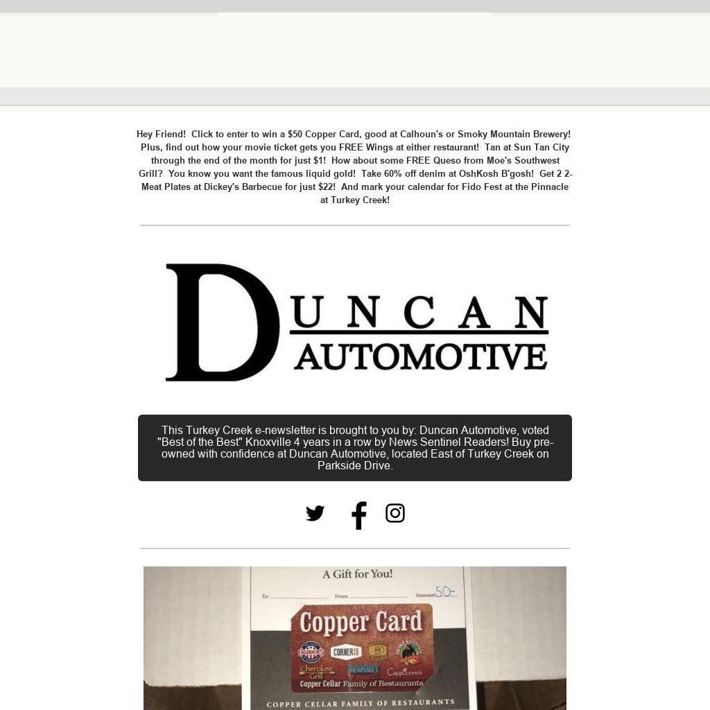 Hey Friend! Click to enter to win a $50 Copper Card, good at Calhoun's or Smoky Mountain Brewery! Plus, find out how your movie ticket gets you FREE Wings at either restaurant! Tan at Sun Tan City through the end of the month for just $1! How about some FREE Queso from Moe's Southwest Grill? You know you want the famous liquid gold! Take 60% off denim at OshKosh B'gosh! Get 2 2-Meat Plates at Dickey's Barbecue for just $22! And mark your calendar for Fido Fest at the Pinnacle at Turkey Creek!