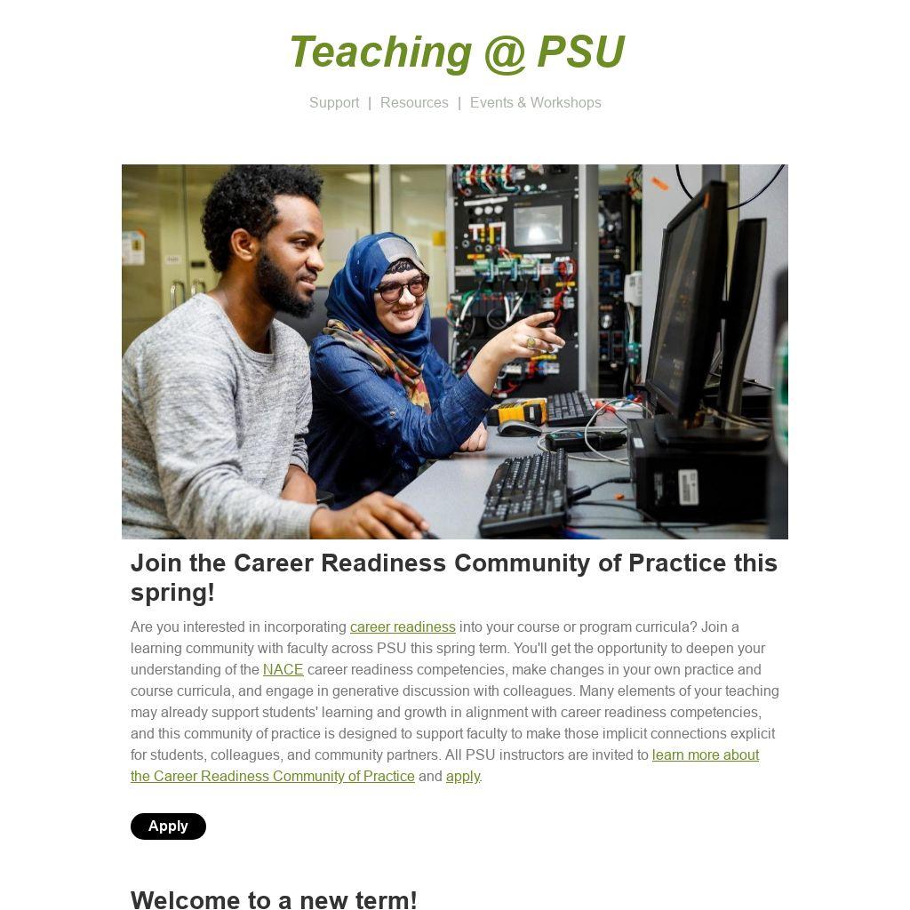 Are you interested in incorporating career readiness into your course or program curricula? Join a learning community with faculty across PSU this spring term. You'll get the opportunity to deepen your understanding of the NACE career readiness competencies, make changes in your own practice and course curricula, and engage in generative discussion with colleagues. Many elements of your teaching may already support students' learning and growth in alignment with career readiness competencies, and this community of practice is designed to support faculty to make those implicit connections explicit for students, colleagues, and community partners. All PSU instructors are invited to learn more about the Career Readiness Community of Practice and apply.