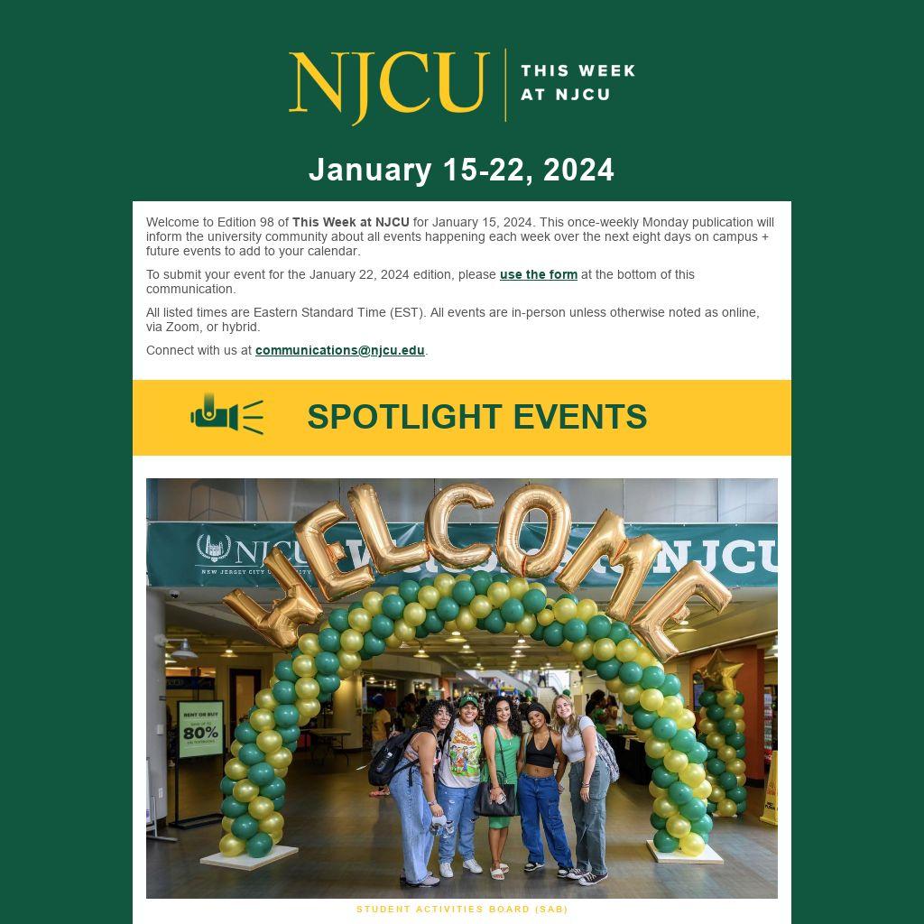 Welcome to Edition 98 of This Week at NJCU for January 15, 2024. This once-weekly Monday publication will inform the university community about all events happening each week over the next eight days on campus + future events to add to your calendar.