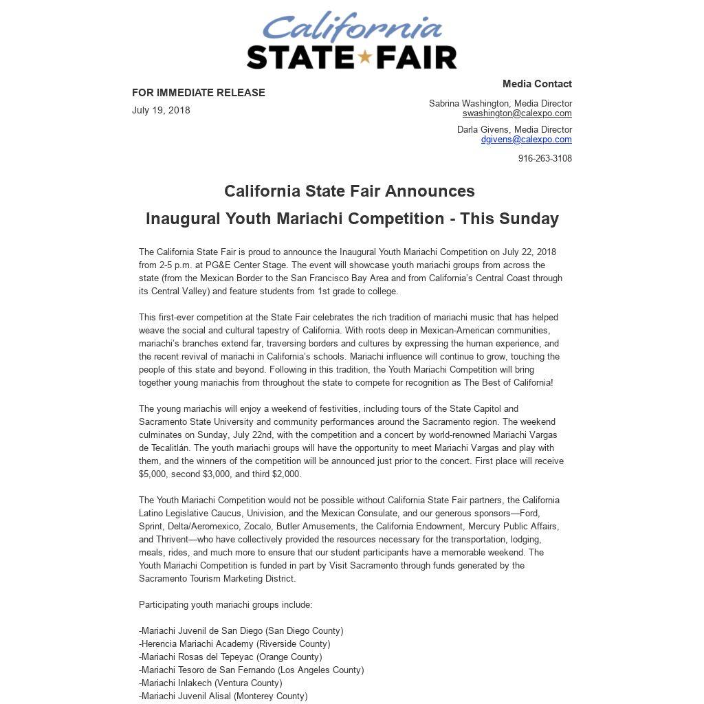 The California State Fair is proud to announce the Inaugural Youth Mariachi Competition on July 22, 2018 from 2-5 p.m. at PG&E Center Stage. The event will showcase youth mariachi groups from across the state (from the Mexican Border to the San Francisco Bay Area and from California’s Central Coast through its Central Valley) and feature students from 1st grade to college.