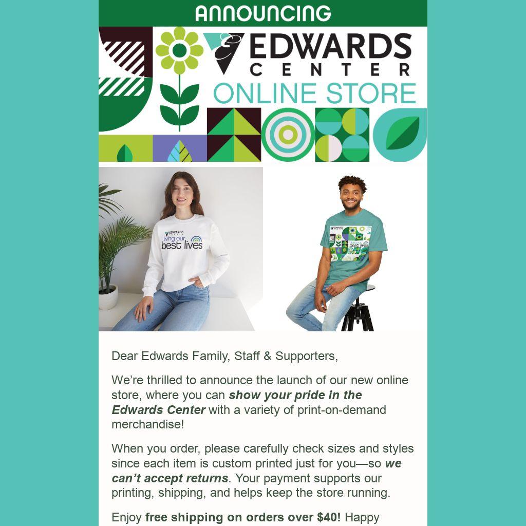 We’re thrilled to announce the launch of our new online store, where you can show your pride in the Edwards Center with a variety of print-on-demand merchandise!