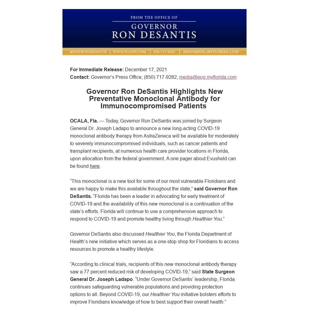 Governor Ron DeSantis Highlights New Preventative Monoclonal Antibody for Immunocompromised Patients