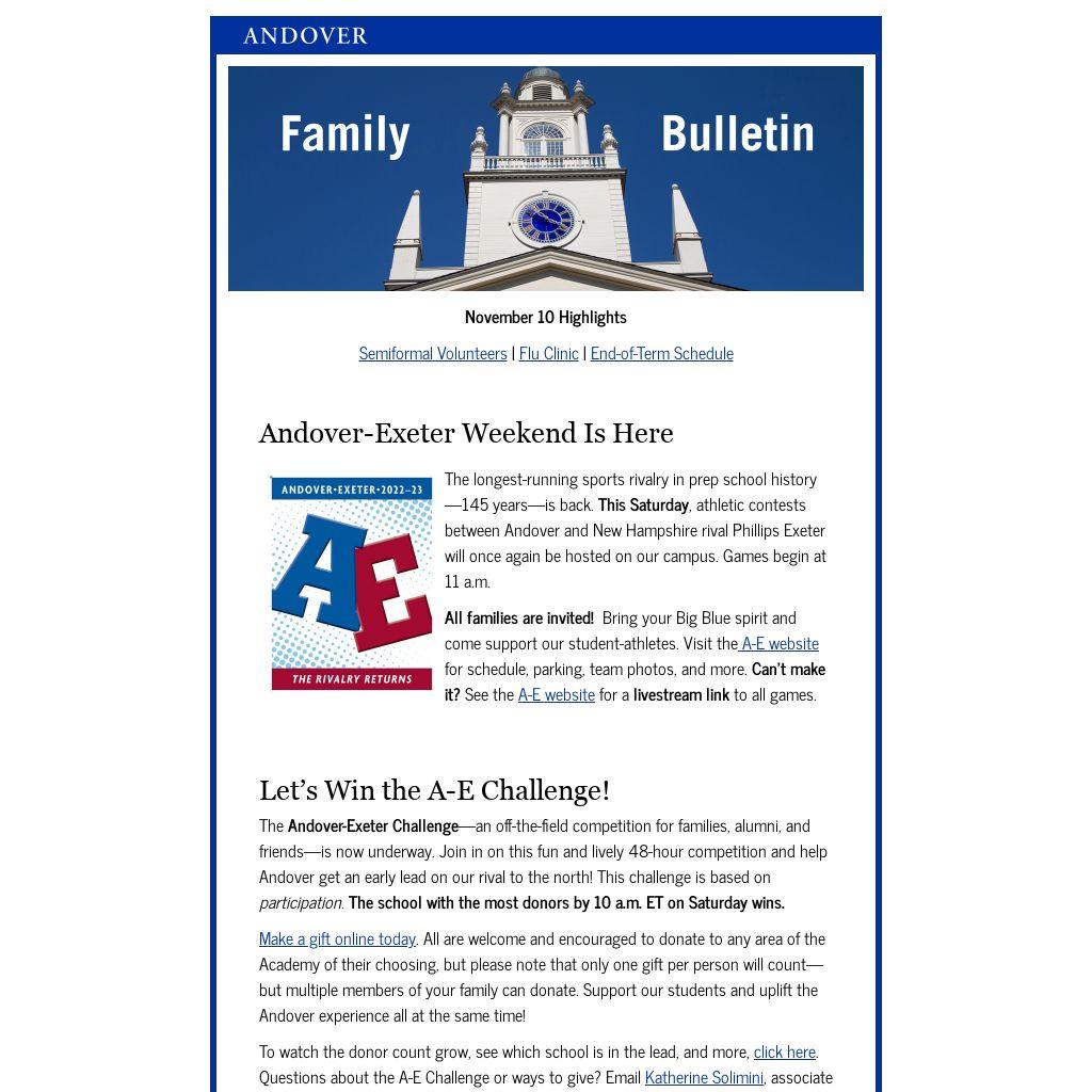 The Andover-Exeter Challenge—an off-the-field competition for families, alumni, and friends—is now underway. Join in on this fun and lively 48-hour competition and help Andover get an early lead on our rival to the north! This challenge is based on participation. The school with the most donors by 10 a.m. ET on Saturday wins.