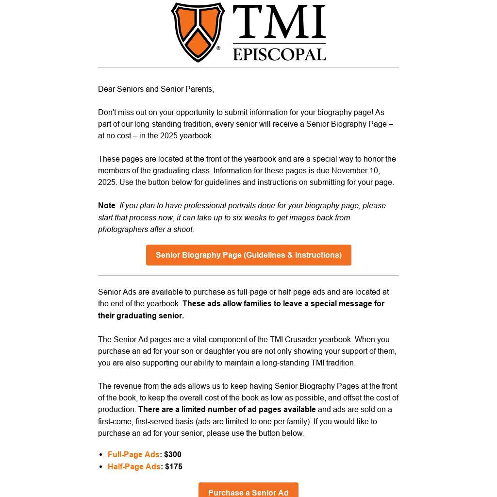 The Senior Ad pages are a vital component of the TMI Crusader yearbook. When you purchase an ad for your son or daughter you are not only showing your support of them, you are also supporting our ability to maintain a long-standing TMI tradition.