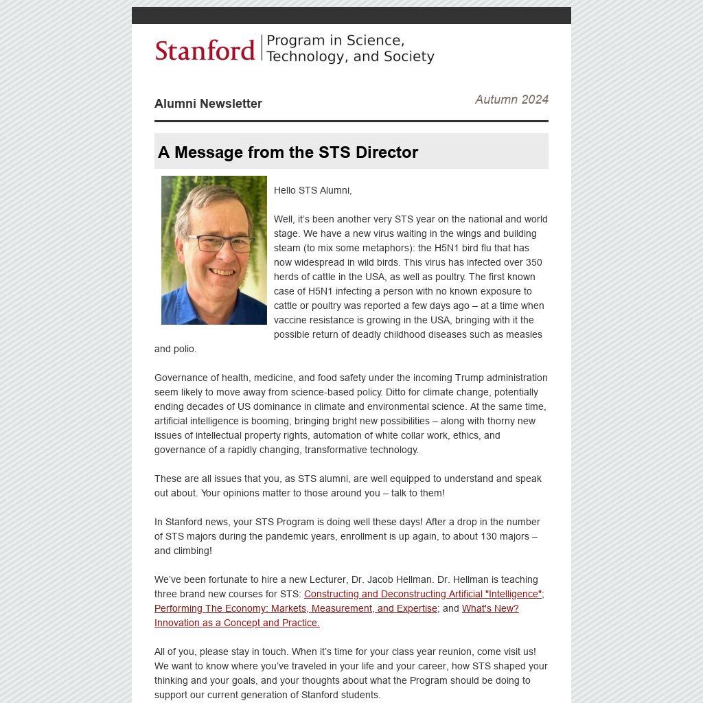 All of you, please stay in touch. When it’s time for your class year reunion, come visit us! We want to know where you’ve traveled in your life and your career, how STS shaped your thinking and your goals, and your thoughts about what the Program should be doing to support our current generation of Stanford students.