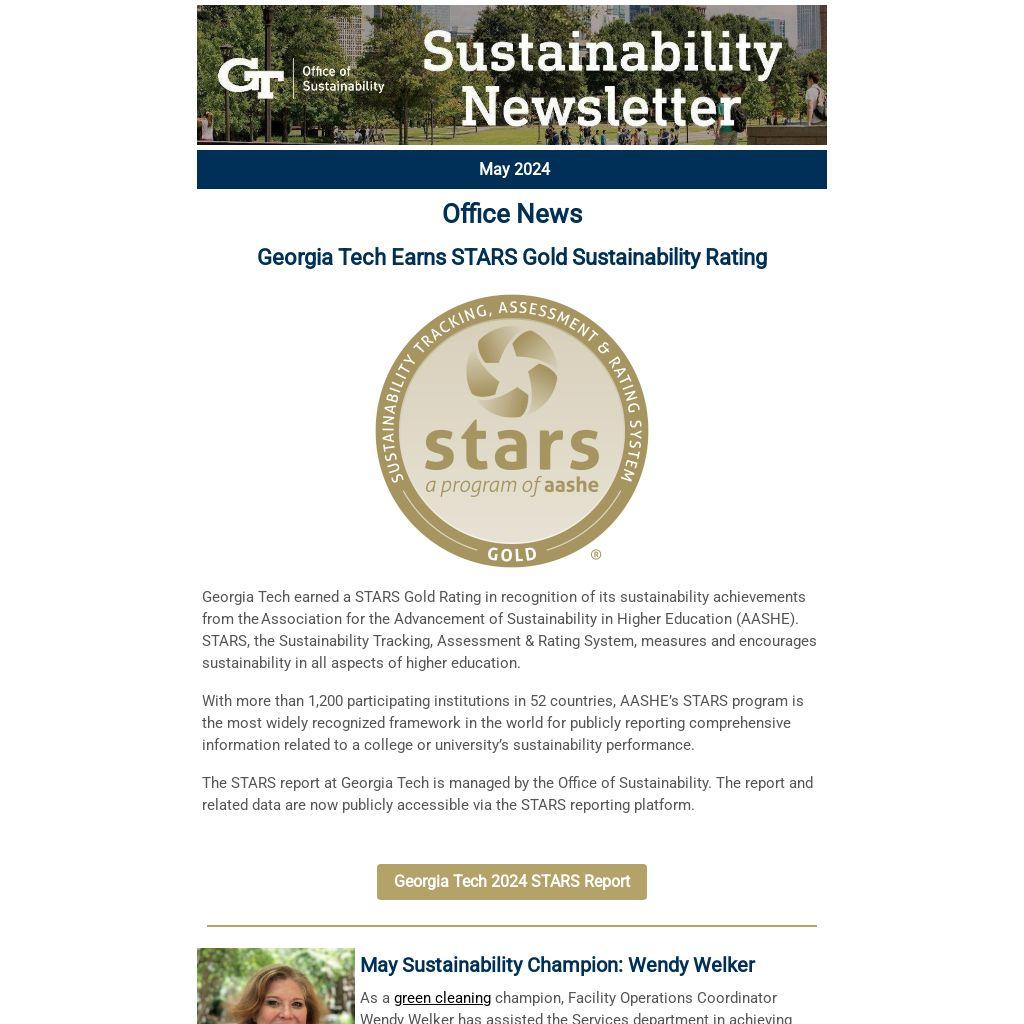 Georgia Tech earned a STARS Gold Rating in recognition of its sustainability achievements from the Association for the Advancement of Sustainability in Higher Education (AASHE). STARS, the Sustainability Tracking, Assessment & Rating System, measures and encourages sustainability in all aspects of higher education.