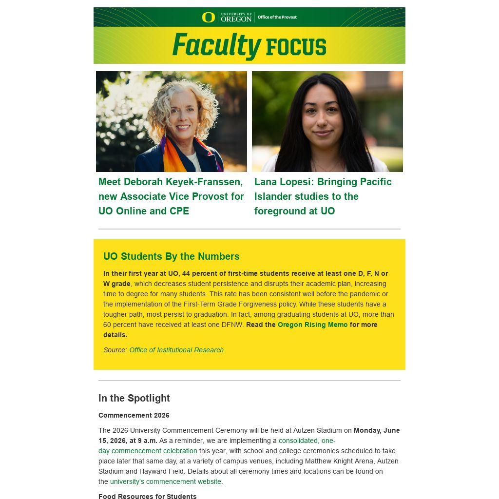 The 2026 University Commencement Ceremony will be held at Autzen Stadium on Monday, June 15, 2026, at 9 a.m. As a reminder, we are implementing a consolidated, one-day commencement celebration this year, with school and college ceremonies scheduled to take place later that same day, at a variety of campus venues, including Matthew Knight Arena, Autzen Stadium and Hayward Field. Details about all ceremony times and locations can be found on the university’s commencement website.