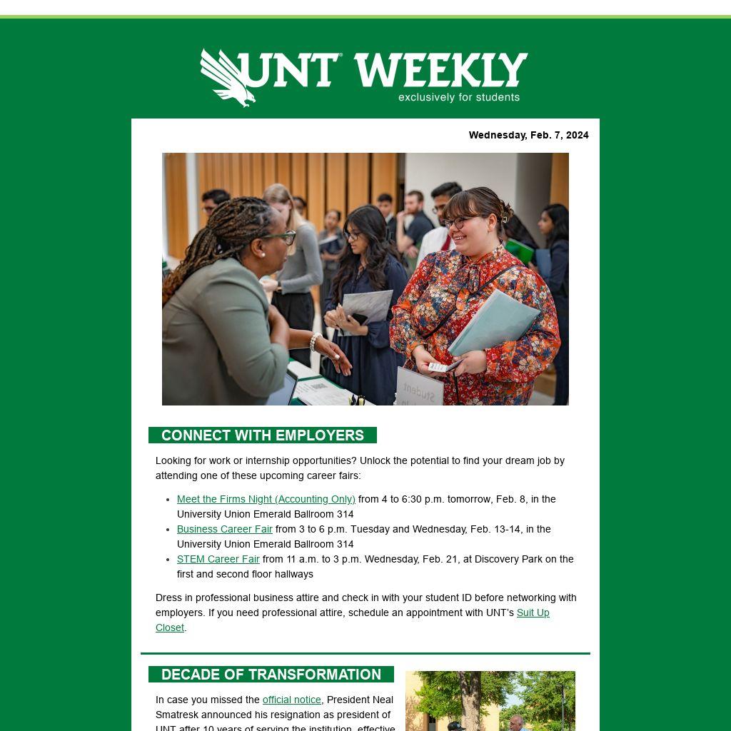 Dress in professional business attire and check in with your student ID before networking with employers. If you need professional attire, schedule an appointment with UNT’s Suit Up Closet.