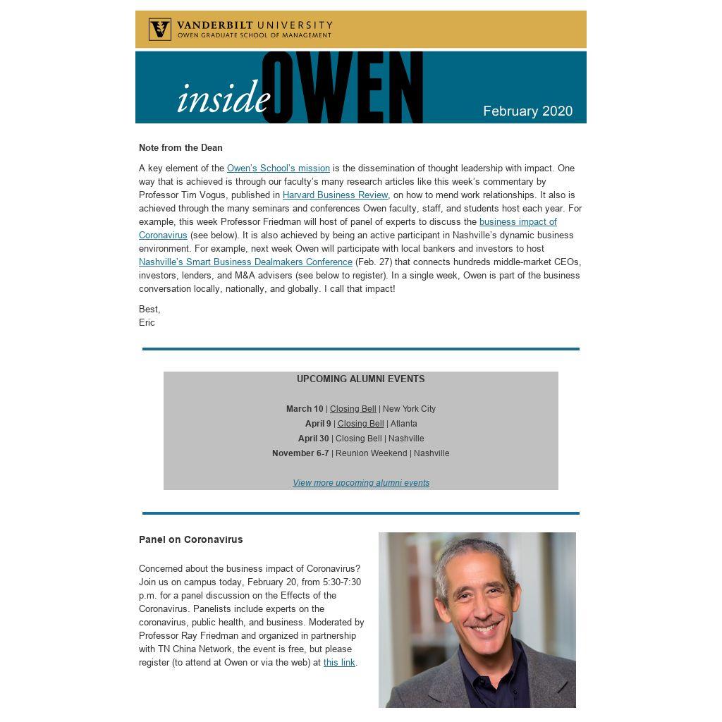 A key element of the Owen’s School’s mission is the dissemination of thought leadership with impact. One way that is achieved is through our faculty’s many research articles like this week’s commentary by Professor Tim Vogus, published in Harvard Business Review, on how to mend work relationships. It also is achieved through the many seminars and conferences Owen faculty, staff, and students host each year. For example, this week Professor Friedman will host of panel of experts to discuss the business impact of Coronavirus (see below). It is also achieved by being an active participant in Nashville’s dynamic business environment. For example, next week Owen will participate with local bankers and investors to host Nashville’s Smart Business Dealmakers Conference (Feb. 27) that connects hundreds middle-market CEOs, investors, lenders, and M&A advisers (see below to register). In a single week, Owen is part of the business conversation locally, nationally, and globally. I call that impact!