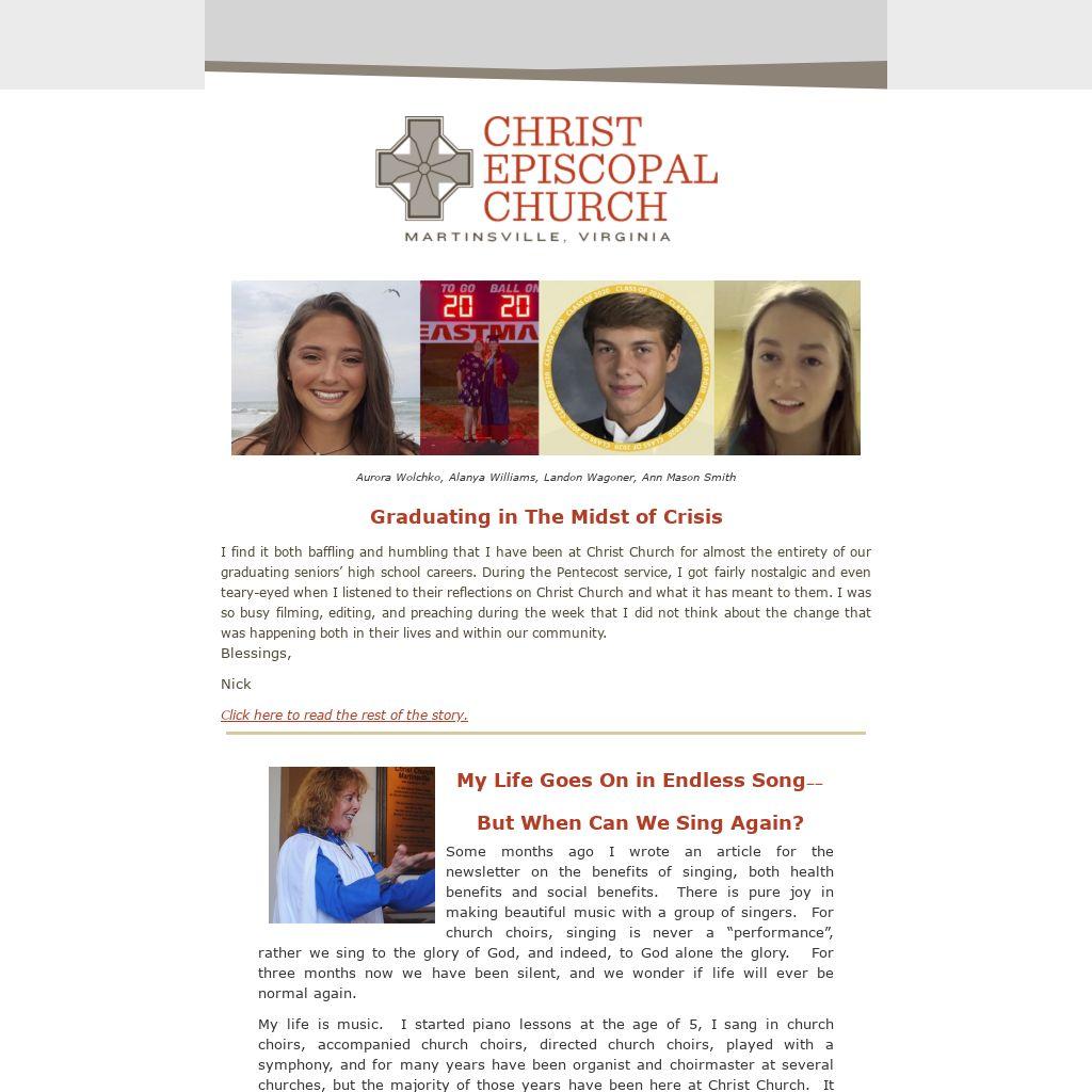 Some months ago I wrote an article for the newsletter on the benefits of singing, both health benefits and social benefits. There is pure joy in making beautiful music with a group of singers. For church choirs, singing is never a “performance”, rather we sing to the glory of God, and indeed, to God alone the glory. For three months now we have been silent, and we wonder if life will ever be normal again.
