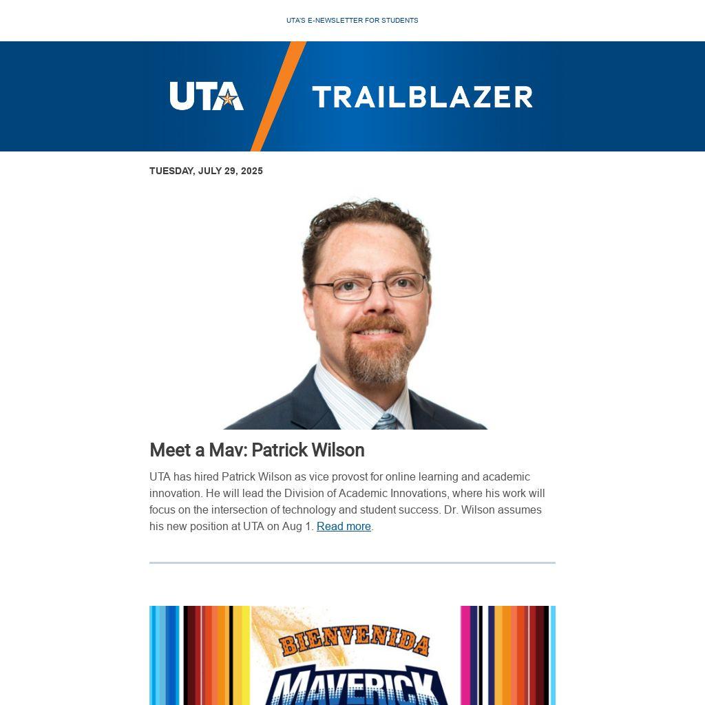 UTA has hired Patrick Wilson as vice provost for online learning and academic innovation. He will lead the Division of Academic Innovations, where his work will focus on the intersection of technology and student success. Dr. Wilson assumes his new position at UTA on Aug 1. Read more.