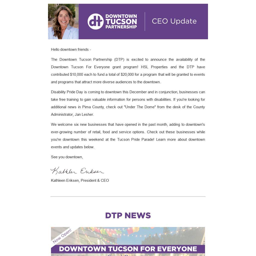 The Downtown Tucson Partnership (DTP) is excited to announce the availabilityĀ of the Downtown Tucson For Everyone grant program! HSL PropertiesĀ and the DTP have contributed $10,000 each to fund a total of $20,000 for a program that will be granted to events and programs that attract more diverse audiences to the downtown.