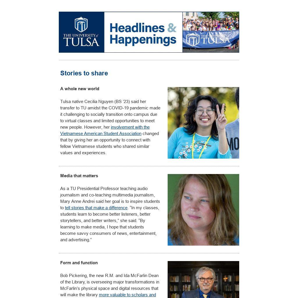 As a TU Presidential Professor teaching audio journalism and co-teaching multimedia journalism, Mary Anne Andrei said her goal is to inspire students to tell stories that make a difference. “In my classes, students learn to become better listeners, better storytellers, and better writers,” she said. “By learning to make media, I hope that students become savvy consumers of news, entertainment, and advertising.”