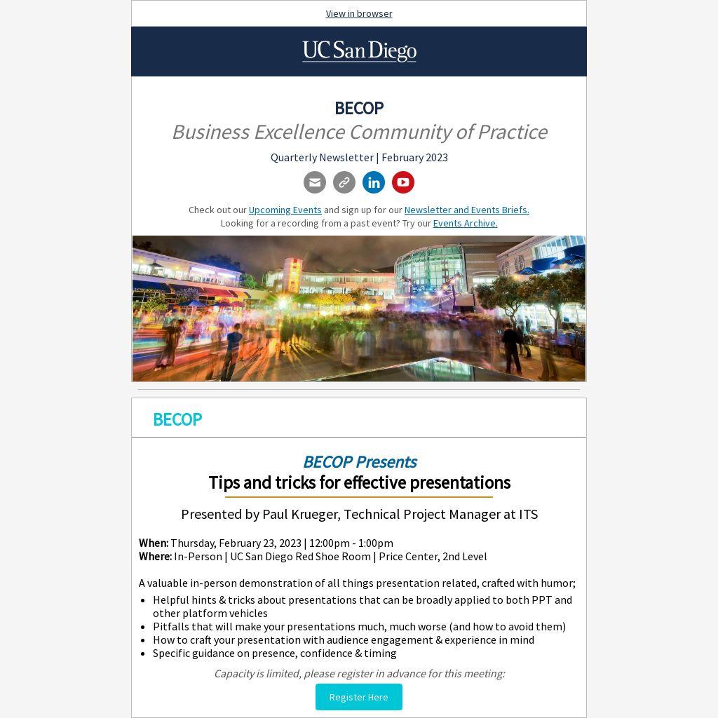 Where: In-Person | UC San Diego Red Shoe Room | Price Center, 2nd Level A valuable in-person demonstration of all things presentation related, crafted with humor;