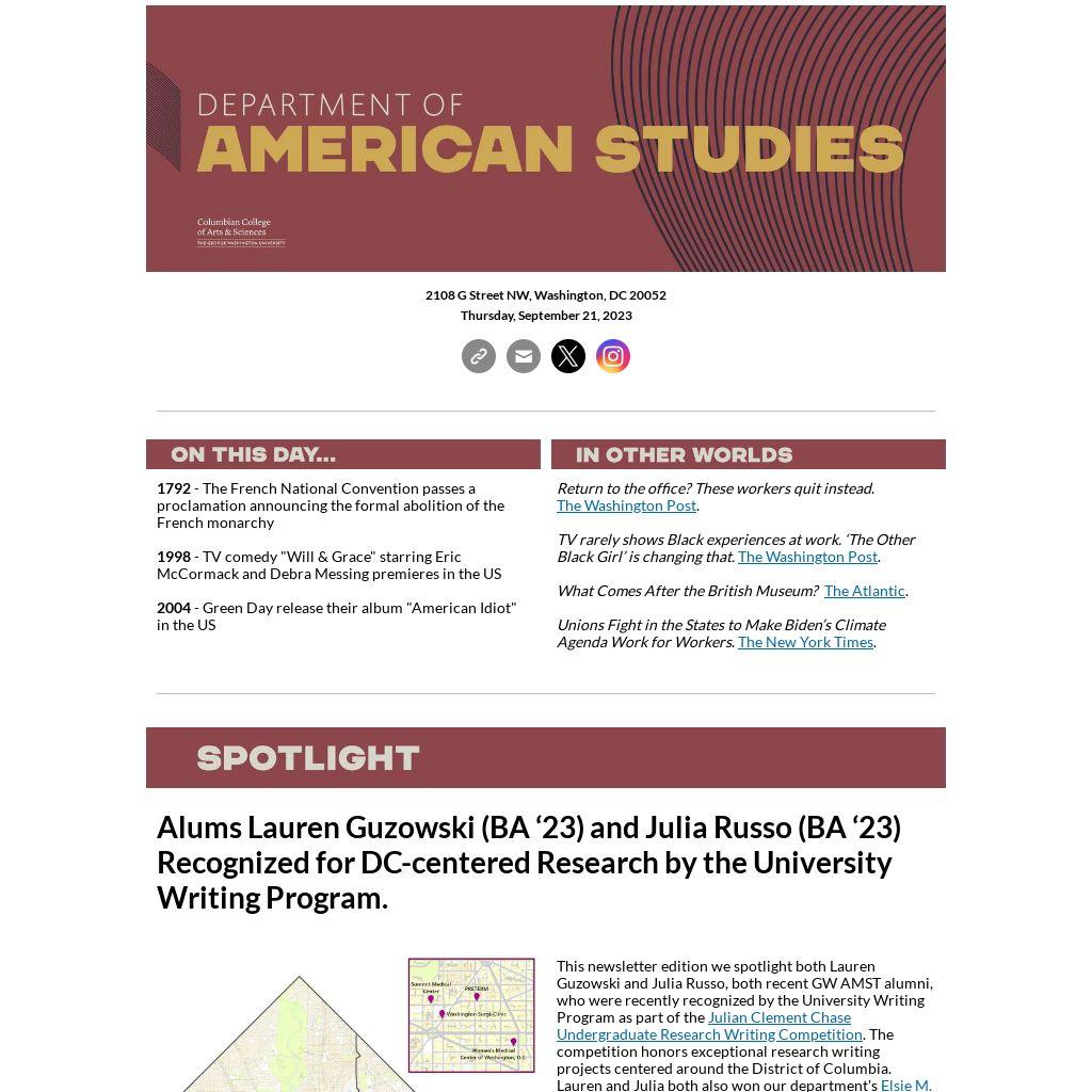 This newsletter edition we spotlight both Lauren Guzowski and Julia Russo, both recent GW AMST alumni, who were recently recognized by the University Writing Program as part of the Julian Clement Chase Undergraduate Research Writing Competition. The competition honors exceptional research writing projects centered around the District of Columbia. Lauren and Julia both also won our department's Elsie M. Carper Prize for Outstanding Senior Research Essay, which is given out annually to graduating American Studies majors who exhibited extraordinary research and writing abilities.
