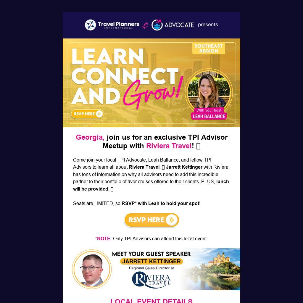 Georgia, join us for an exclusive TPI Advisor Meetup with Riviera Travel! ✨