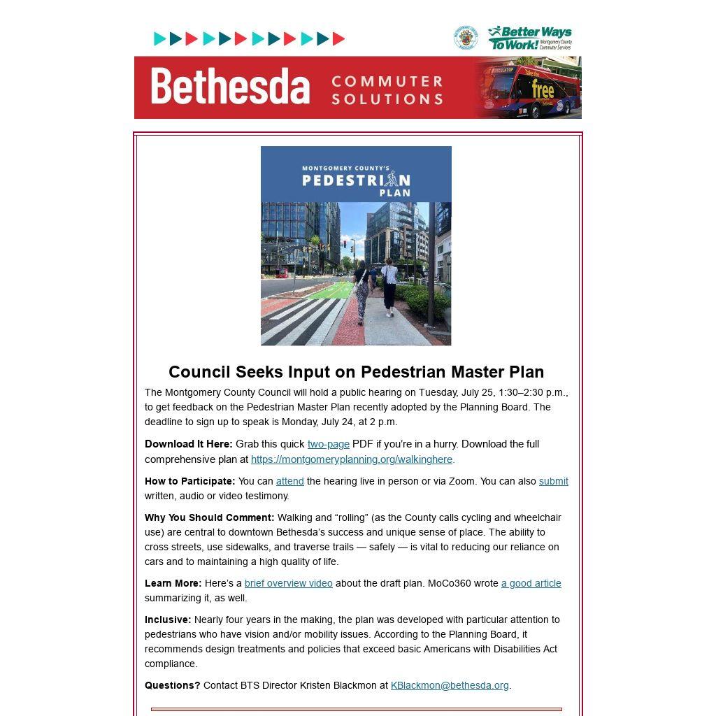 The Montgomery County Council will hold a public hearing on Tuesday, July 25, 1:30–2:30 p.m., to get feedback on the Pedestrian Master Plan recently adopted by the Planning Board. The deadline to sign up to speak is Monday, July 24, at 2 p.m.