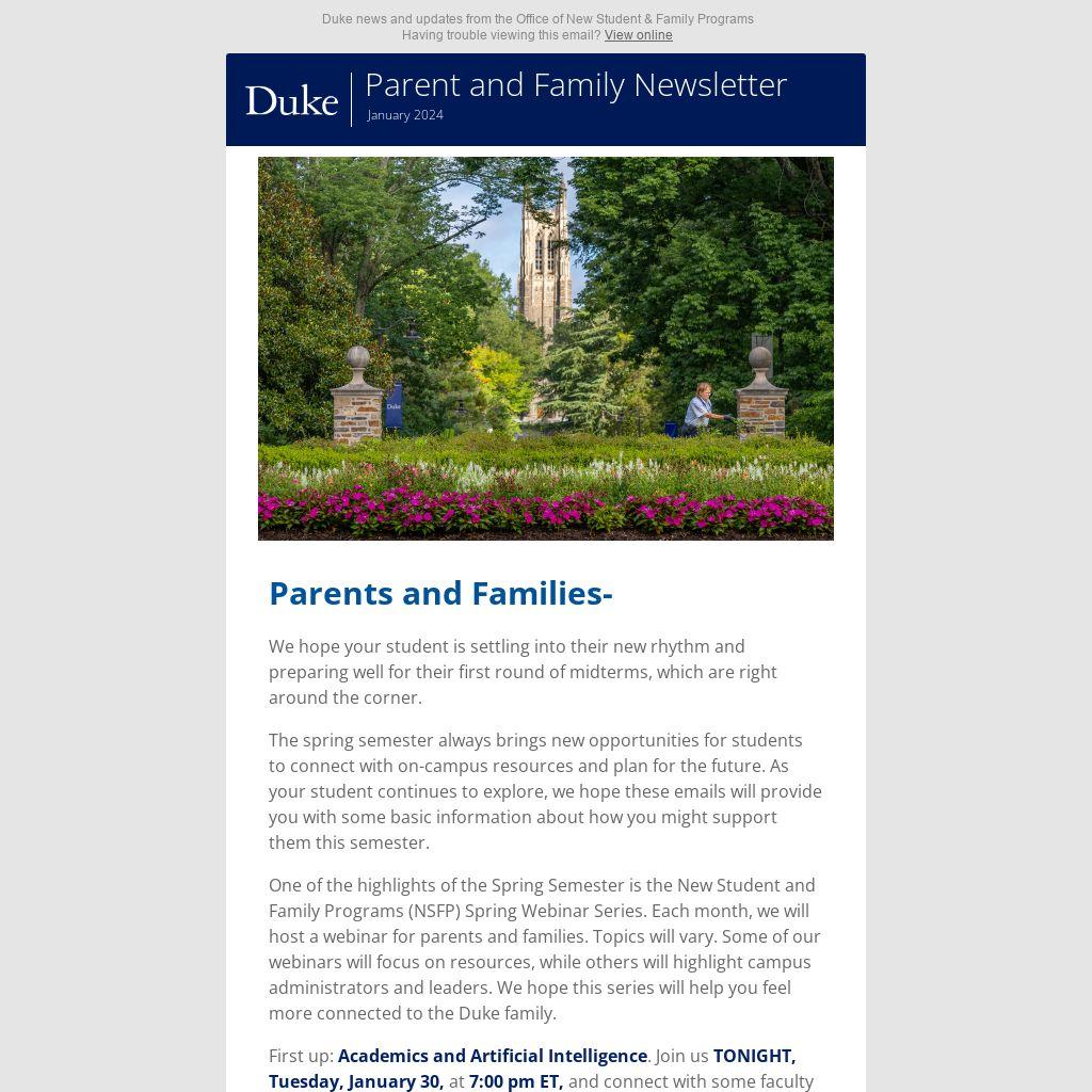 More Family Weekend details, a full schedule, and registration will be posted to the Duke Family webpage in late Summer/ early Fall.