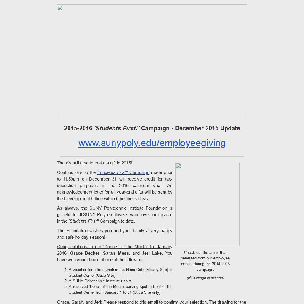 Contributions to the 'Students First!' Campaign made prior to 11:59pm on December 31 will receive credit for tax-deduction purposes in the 2015 calendar year. An acknowledgement letter for all year-end gifts will be sent by the Development Office within 5 business days. As always, the SUNY Polytechnic Institute Foundation is grateful to all SUNY Poly employees who have participated in the 'Students First!' Campaign to date.
