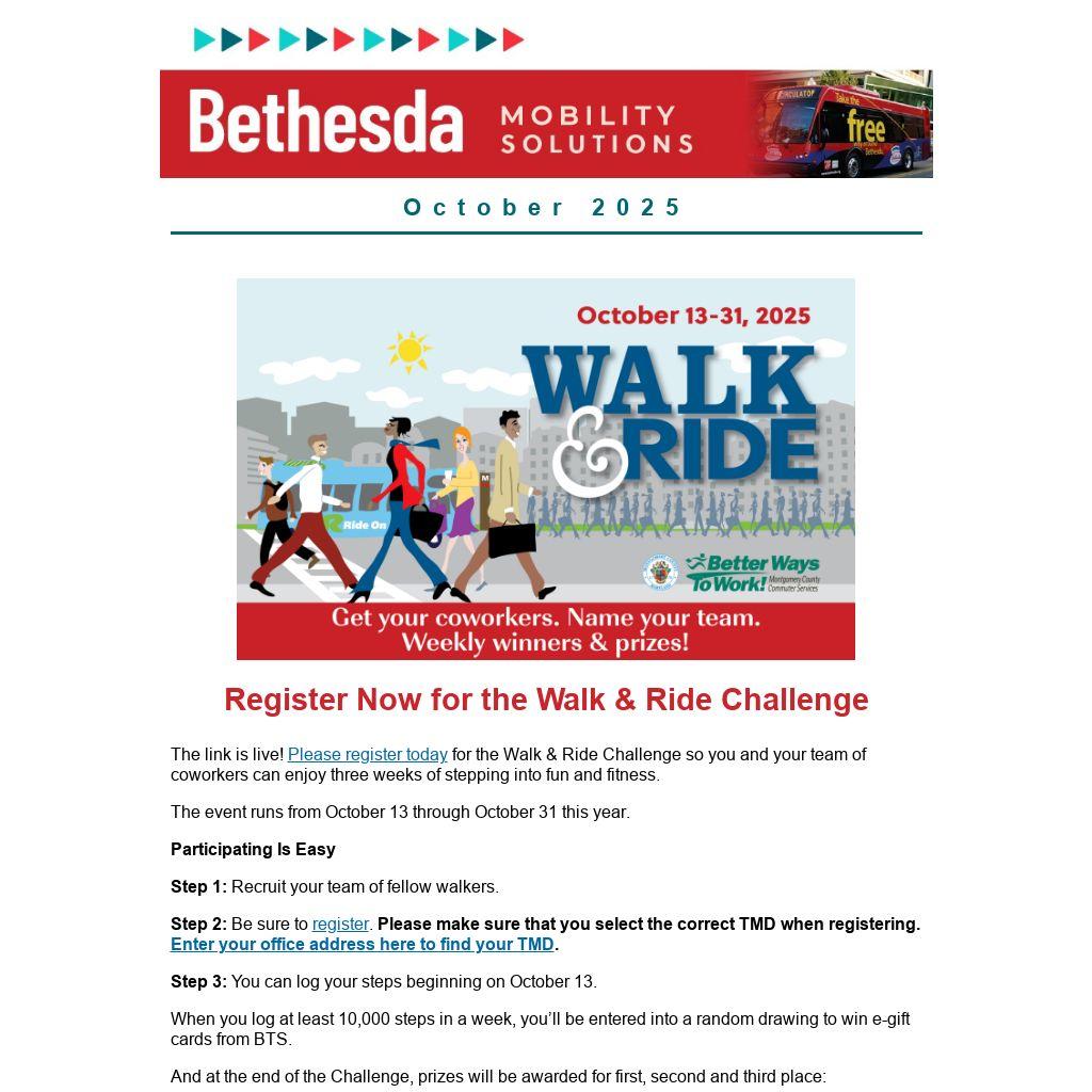 Carla: Our Chamber staff of three formed a Walk & Ride Challenge team — “Chamber Champions in Motion” — because it aligns perfectly with our mission: modeling healthy, sustainable commute habits for the very employers we serve. The Challenge makes it easy — and fun — for Bethesda-based employees to fold more walking into their day by trying alternatives to driving alone, which is exactly the behavior change we want to champion across our community.