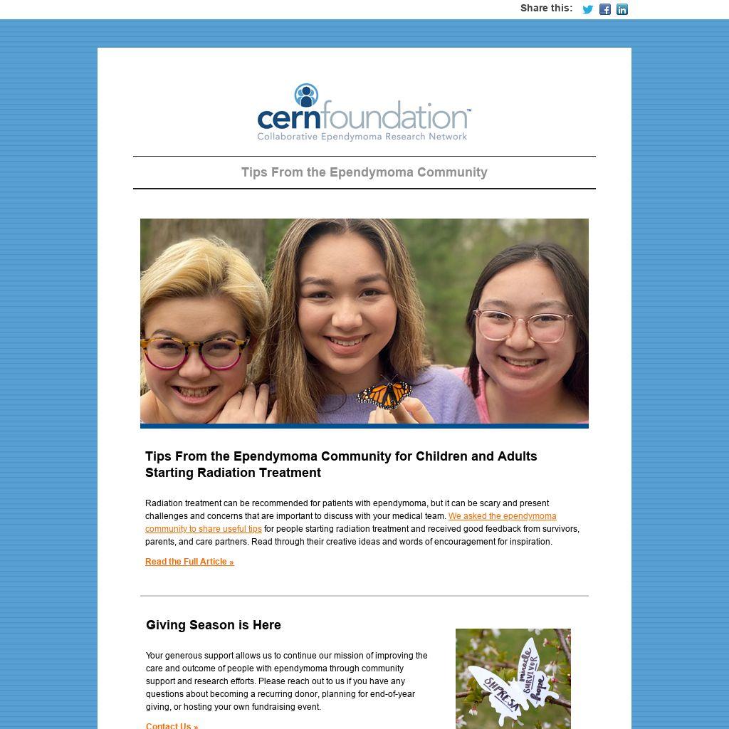 Your generous support allows us to continue our mission of improving the care and outcome of people with ependymoma through community support and research efforts. Please reach out to us if you have any questions about becoming a recurring donor, planning for end-of-year giving, or hosting your own fundraising event.