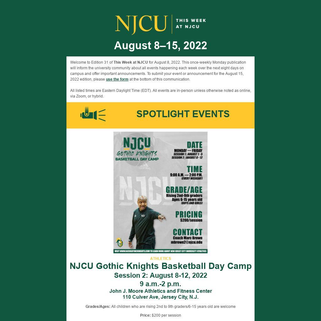 Welcome to Edition 31 of This Week at NJCU for August 8, 2022. This once-weekly Monday publication will inform the university community about all events happening each week over the next eight days on campus and offer important announcements. To submit your event or announcement for the August 15, 2022 edition, please use the form at the bottom of this communication.