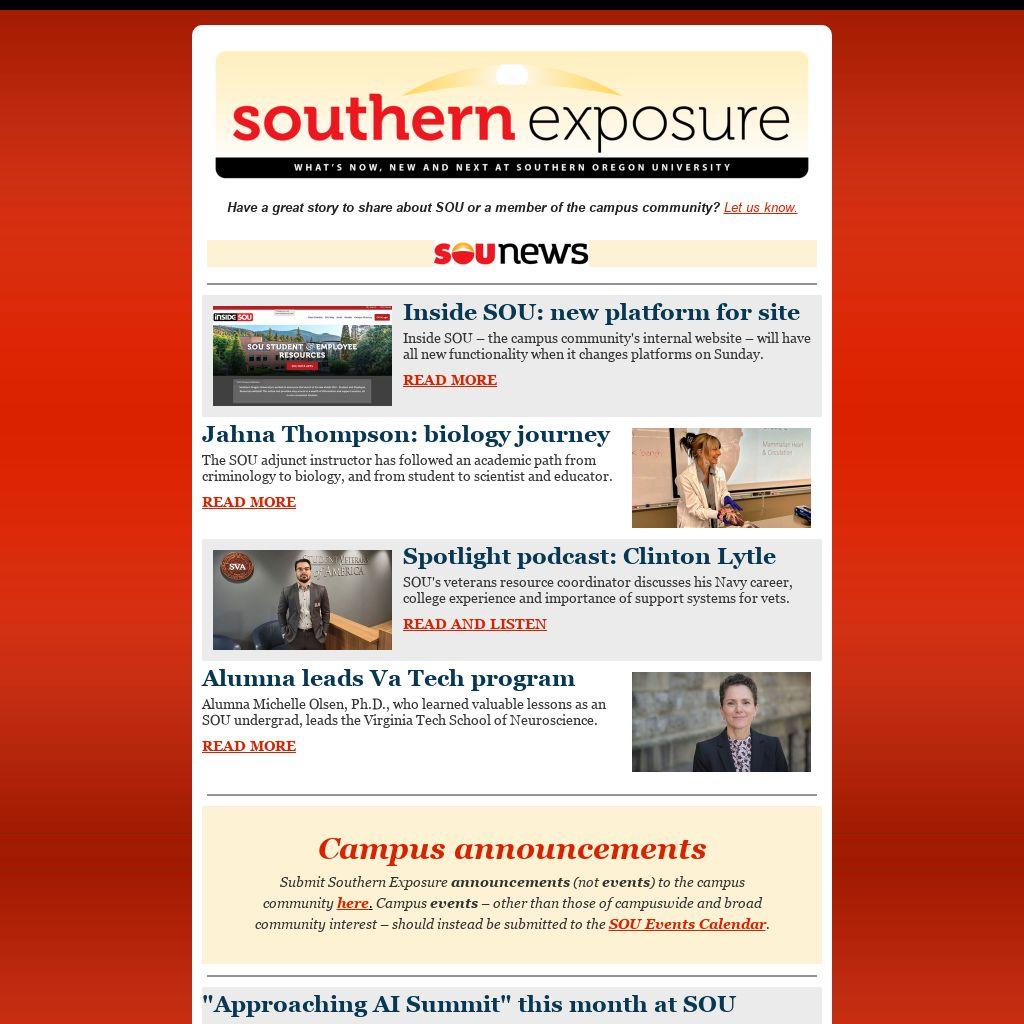 Submit Southern Exposure announcements (not events) to the campus community here. Campus events – other than those of campuswide and broad community interest – should instead be submitted to the SOU Events Calendar.