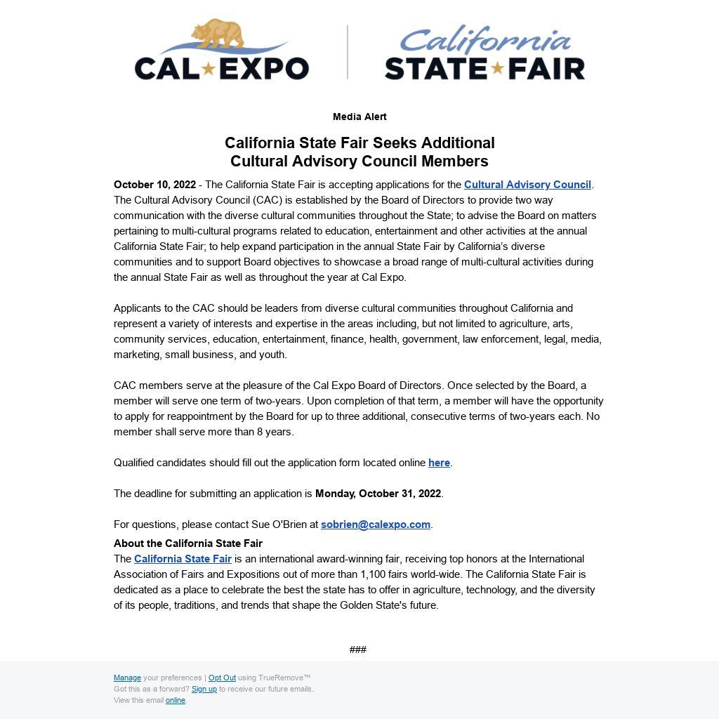 October 10, 2022 - The California State Fair is accepting applications for the Cultural Advisory Council. The Cultural Advisory Council (CAC) is established by the Board of Directors to provide two way communication with the diverse cultural communities throughout the State; to advise the Board on matters pertaining to multi-cultural programs related to education, entertainment and other activities at the annual California State Fair; to help expand participation in the annual State Fair by California’s diverse communities and to support Board objectives to showcase a broad range of multi-cultural activities during the annual State Fair as well as throughout the year at Cal Expo.