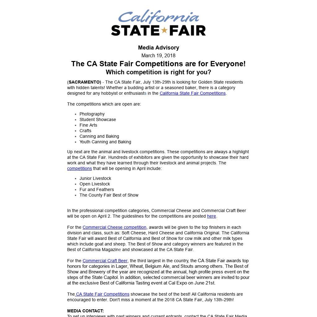 MEDIA CONTACT: To set up interviews with past winners and current entrants, contact the CA State Fair Media Office at 916-263-3108.
