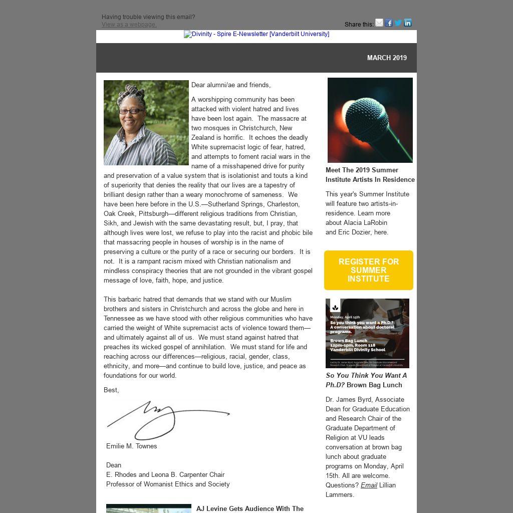 This barbaric hatred that demands that we stand with our Muslim brothers and sisters in Christchurch and across the globe and here in Tennessee as we have stood with other religious communities who have carried the weight of White supremacist acts of violence toward them—and ultimately against all of us. We must stand against hatred that preaches its wicked gospel of annihilation. We must stand for life and reaching across our differences—religious, racial, gender, class, ethnicity, and more—and continue to build love, justice, and peace as foundations for our world.