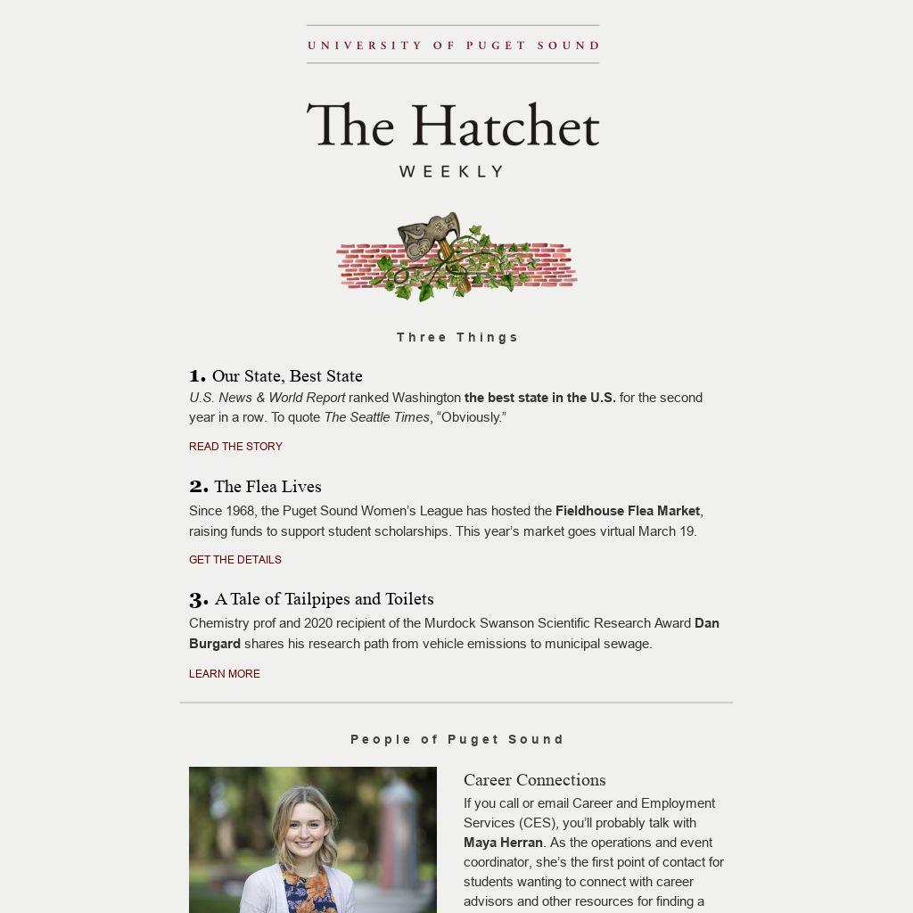Career Connections If you call or email Career and Employment Services (CES), you’ll probably talk with Maya Herran. As the operations and event coordinator, she’s the first point of contact for students wanting to connect with career advisors and other resources for finding a job or internship. She knows a thing or two about trying different career paths, having previously worked as a nanny, food truck cashier, outreach representative, church musician, and research assistant. In addition to answering student, parent, and alumni questions, Herran also handles the nitty gritty details of events like the recent Future Heights Career Conference and helps student workers complete employment forms like the I-9. Herran recently moved back to Tacoma and is rediscovering the city with her partner and their rescue dog, Tuna. When she’s not working or spending time with family, she enjoys making her own clothes. Her goal for 2021? To avoid buying any new clothing for her wardrobe and instead knit, sew, or thrift any items she needs.