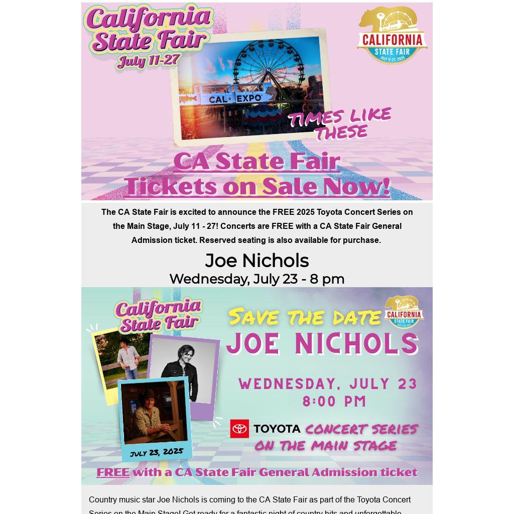 Country music star Joe Nichols is coming to the CA State Fair as part of the Toyota Concert Series on the Main Stage! Get ready for a fantastic night of country hits and unforgettable moments on Wednesday, July 23. The concert is free with general fair admission. Be sure to catch this amazing show during the fair, running from July 11 to 27!
