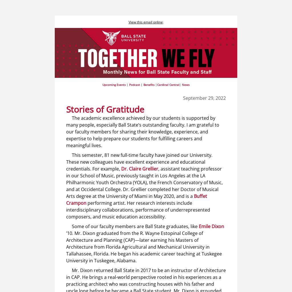 Stories of GratitudeThe academic excellence achieved by our students is supported by many people, especially Ball State’s outstanding faculty. I am grateful to our faculty members for sharing their knowledge, experience, and expertise to help prepare our students for fulfilling careers and meaningful lives.