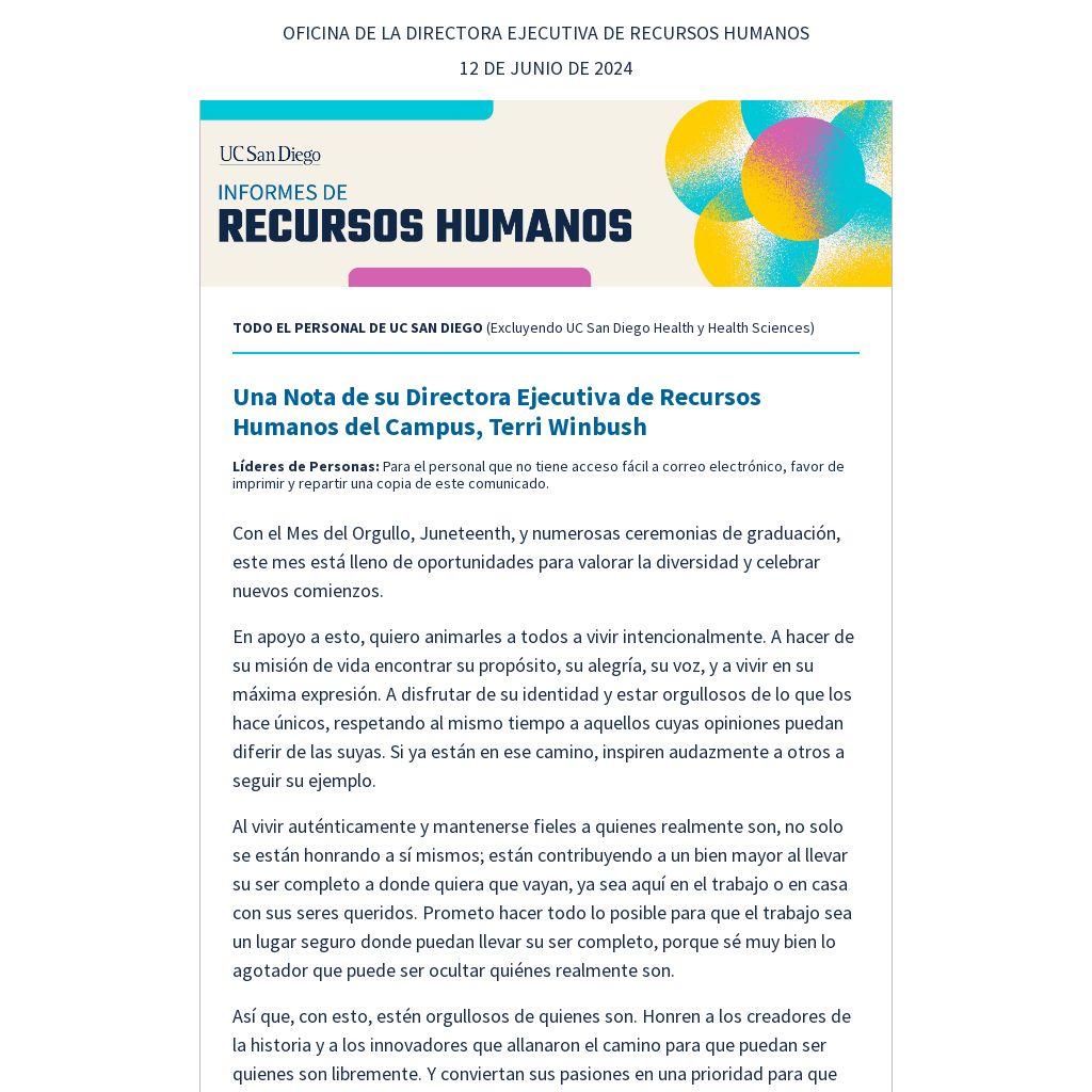 Profesionistas de recursos humanos en el campus de UC San Diego pueden acompañarnos al próximo Foro de Recursos Humanos (HR Forum) el jueves, 27 de junio de 2024, de 10 a 11:30 a.m. El HR Network se reúne cuatro veces al año a través del HR Forum para conectar en oportunidades de desarrollo profesional, mejores prácticas y más. Regístrense a través de Zoom.