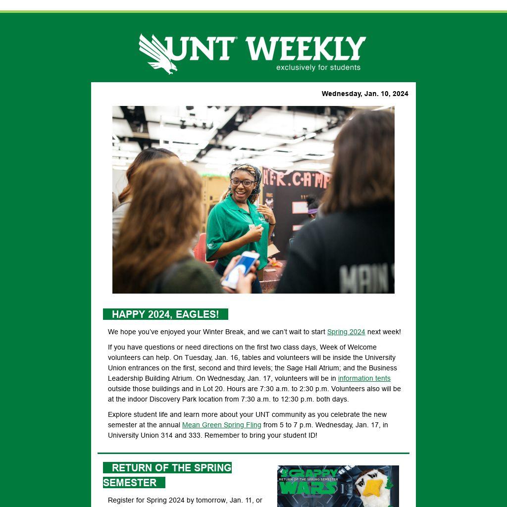 Explore student life and learn more about your UNT community as you celebrate the new semester at the annual Mean Green Spring Fling from 5 to 7 p.m. Wednesday, Jan. 17, in University Union 314 and 333. Remember to bring your student ID!
