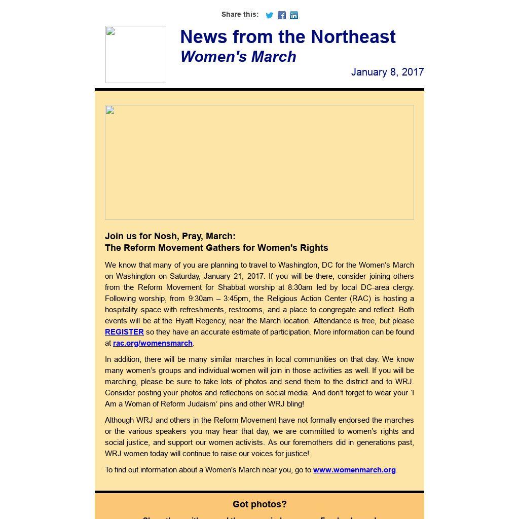 In addition, there will be many similar marches in local communities on that day. We know many women’s groups and individual women will join in those activities as well. If you will be marching, please be sure to take lots of photos and send them to the district and to WRJ. Consider posting your photos and reflections on social media. And don’t forget to wear your ‘I Am a Woman of Reform Judaism’ pins and other WRJ bling!