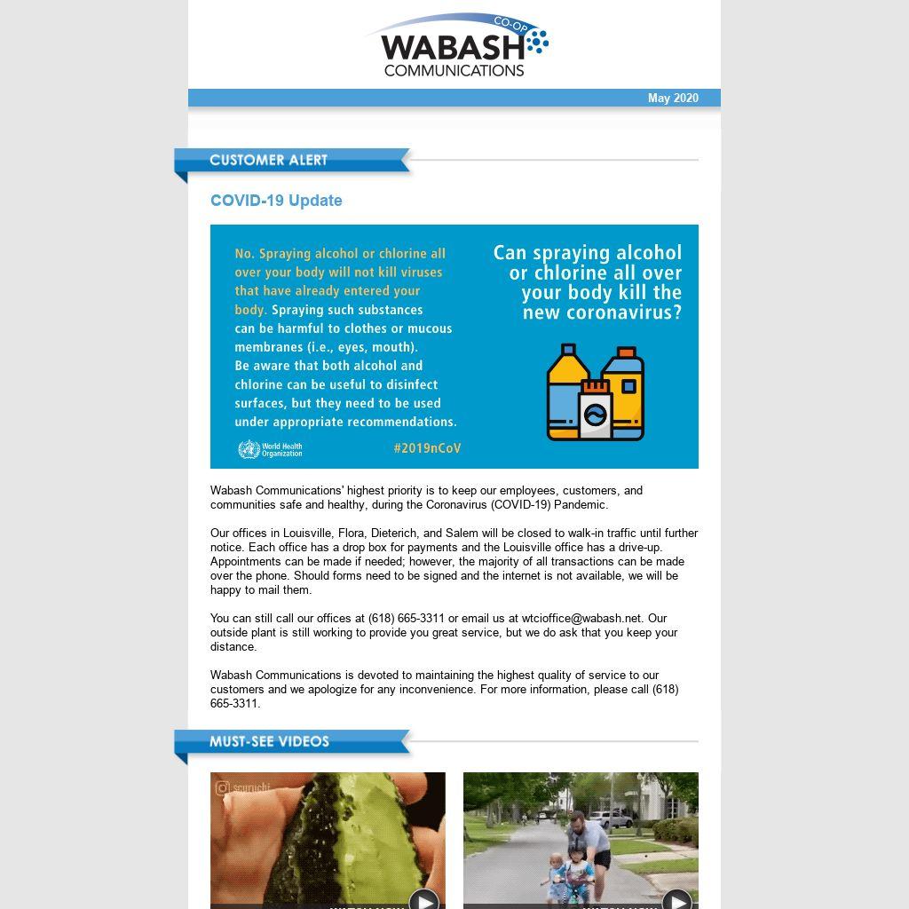 This website was created with you in mind. Wabash Communications CO-OP/Wabash Communications customers can now enjoy their very own Customer Portal with all the resources they need in one spot. This includes paying your bill, email login, and much more! The new website is user-friendly, simplified, and now you have access to all the information you need at your finger tips. Check it out at www.wabash.net.
