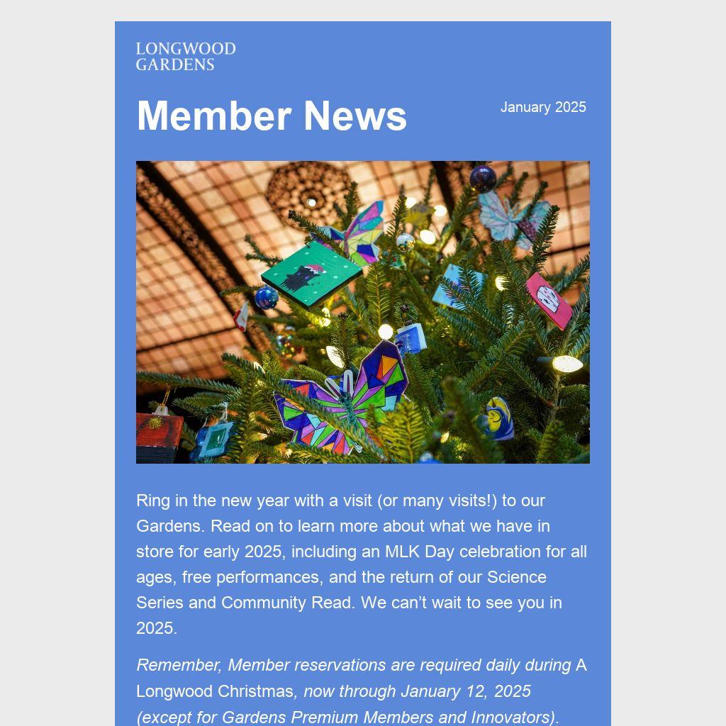 Remember, Member reservations are required daily during A Longwood Christmas, now through January 12, 2025 (except for Gardens Premium Members and Innovators). Member reservations are not required during our Winter Wonder season (January 17–March 23, 2025).