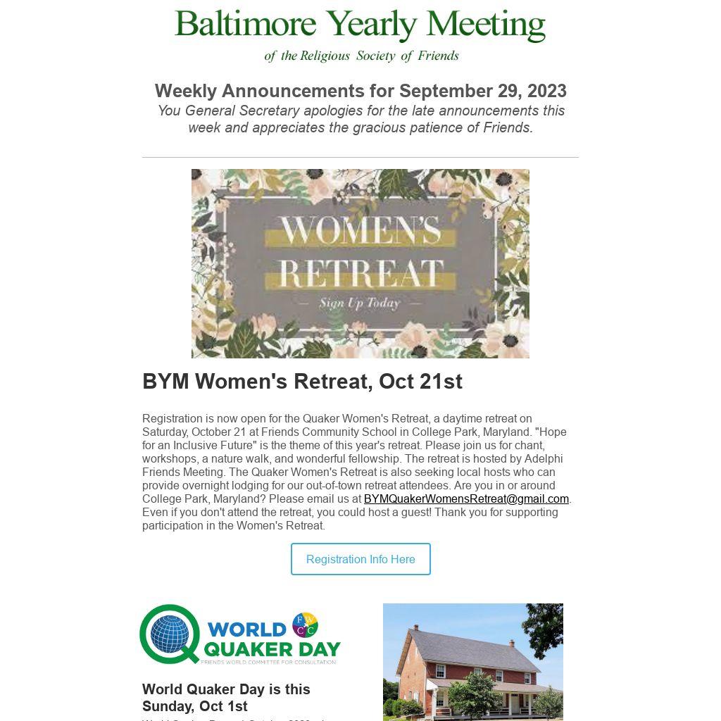 Registration is now open for the Quaker Women's Retreat, a daytime retreat on Saturday, October 21 at Friends Community School in College Park, Maryland. "Hope for an Inclusive Future" is the theme of this year's retreat. Please join us for chant, workshops, a nature walk, and wonderful fellowship. The retreat is hosted by Adelphi Friends Meeting. The Quaker Women's Retreat is also seeking local hosts who can provide overnight lodging for our out-of-town retreat attendees. Are you in or around College Park, Maryland? Please email us at BYMQuakerWomensRetreat@gmail.com. Even if you don't attend the retreat, you could host a guest! Thank you for supporting participation in the Women's Retreat.