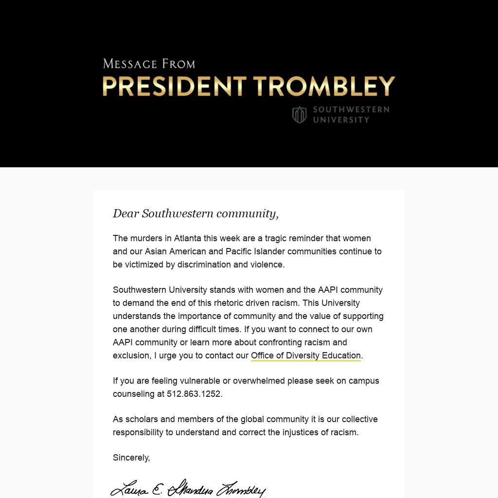 Southwestern University stands with women and the AAPI community to demand the end of this rhetoric driven racism. This University understands the importance of community and the value of supporting one another during difficult times. If you want to connect to our own AAPI community or learn more about confronting racism and exclusion, I urge you to contact our