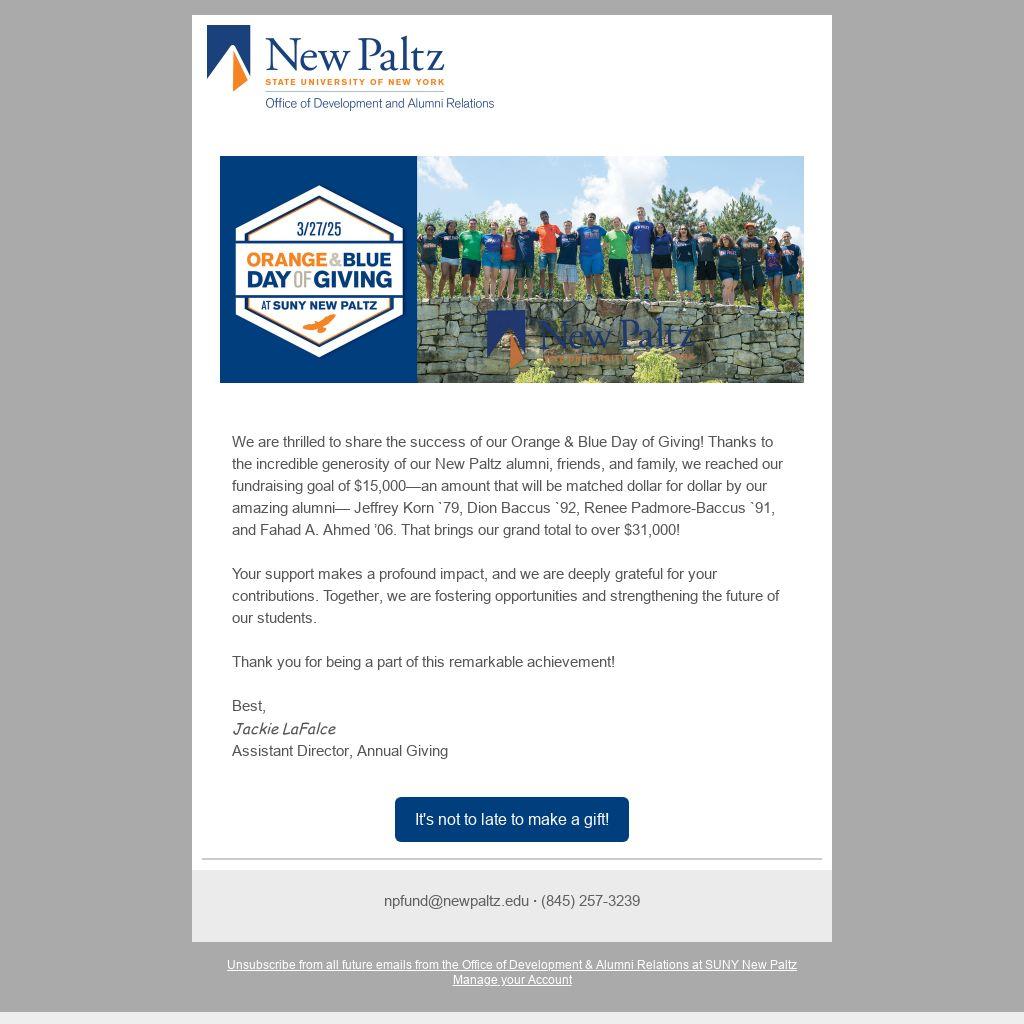 We are thrilled to share the success of our Orange & Blue Day of Giving! Thanks to the incredible generosity of our New Paltz alumni, friends, and family, we reached our fundraising goal of $15,000—an amount that will be matched dollar for dollar by our amazing alumni— Jeffrey Korn `79, Dion Baccus `92, Renee Padmore-Baccus `91, and Fahad A. Ahmed ’06. That brings our grand total to over $31,000!