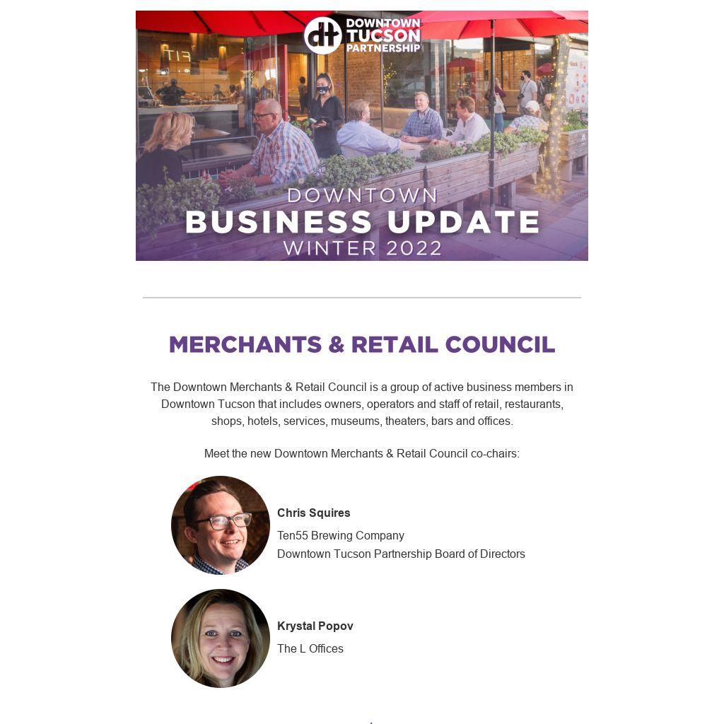 The Downtown Merchants & Retail Council is a group of active business members in Downtown Tucson that includes owners, operators and staff of retail, restaurants, shops, hotels, services, museums, theaters, bars and offices.